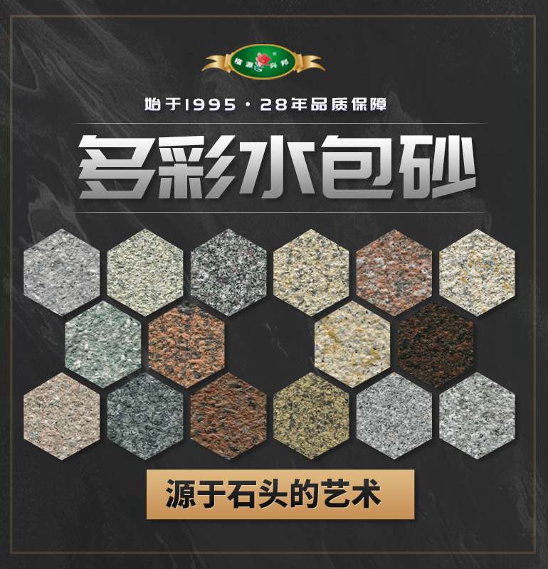 榴源興邦多彩真石漆采用多種顏色的天然彩砂,配上進口優(yōu)質(zhì)聚合物乳液、進口助劑等原材料配制而成,顏色豐富,仿石效果更為逼真,非常接近天然石材,使用高檔酒店、寫字樓、別墅、公寓等建筑。